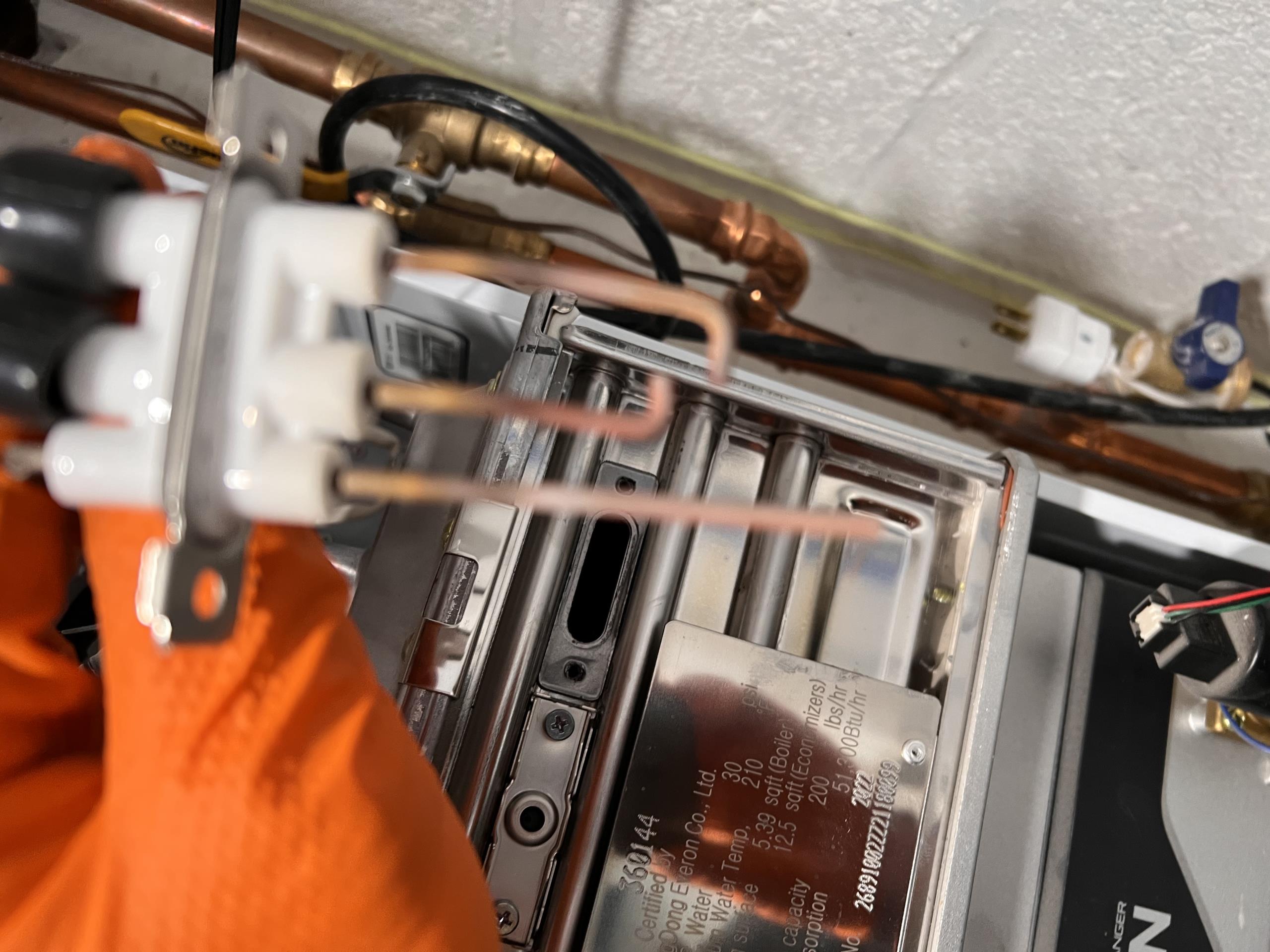 Fort Lee, NJ - Arrived onsite for Navien Boiler maintenance and Flush. Turn on the thermostats up to heat and confirm operation of the boiler and each zone valve. Turned the boiler off and removed heat cover. Inspected heat exchanger. Performed a visual inspection of all electrical and inspected all external water components such as the exp tank, fill valve, backflow preventer and the circulator pump. Clear condensate trap. Cleaned igniter rods. Performed flush of domestic hot water to remove calcium buildup. Confirmed system is operating and heating properly at this time for heat and hot water.