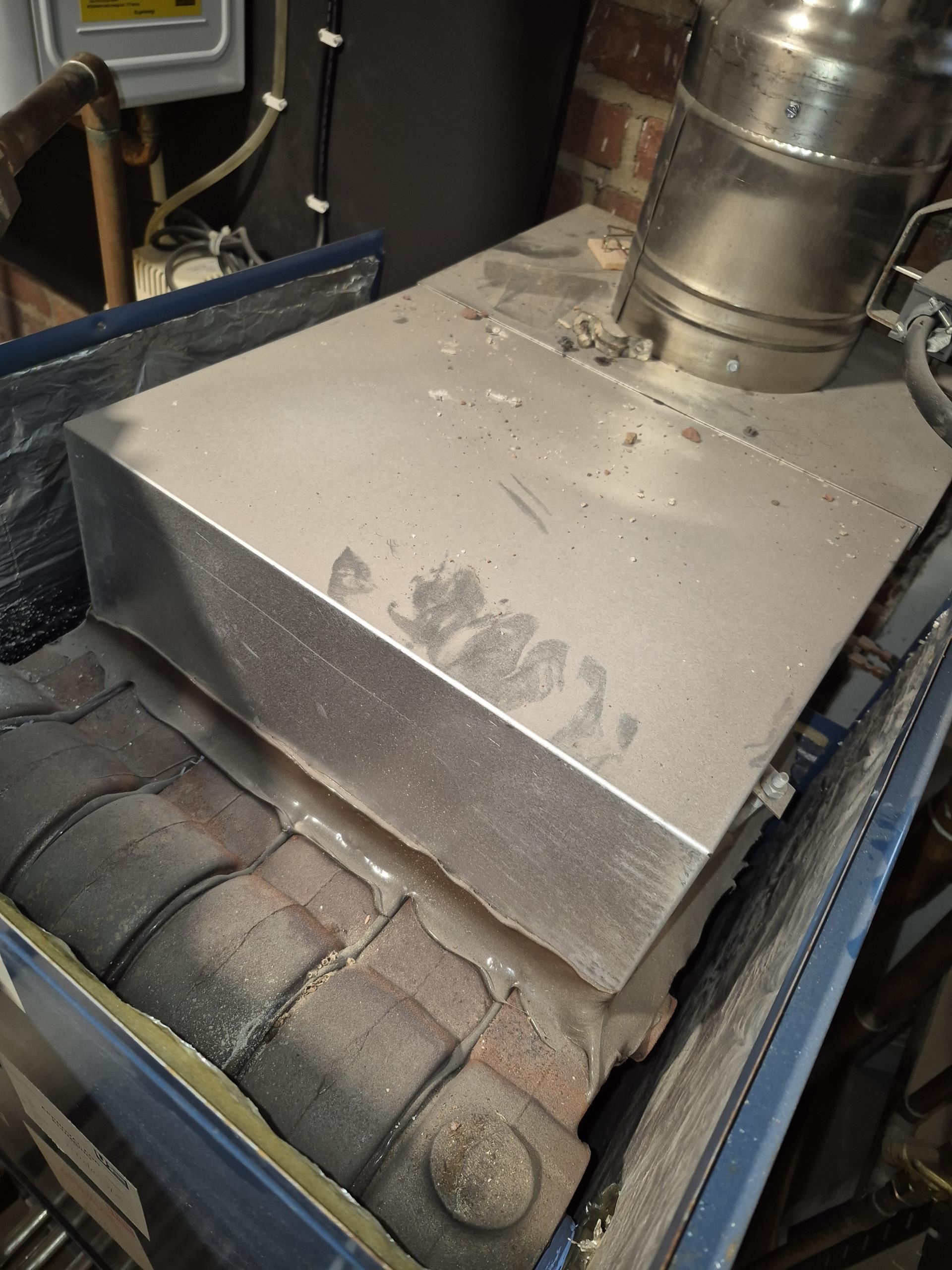 Arrived on site for no heating. Pilot light went out again. Relit the pilot light and stayed for around 5 minutes. Noticed the pressure gauge wasn't reading any PSI. sight glass is clear. Notice some steam coming out inform of the unit, at the burners. Took a peak inside and noticed water dripping on burners. Some water leaked out on the floor.