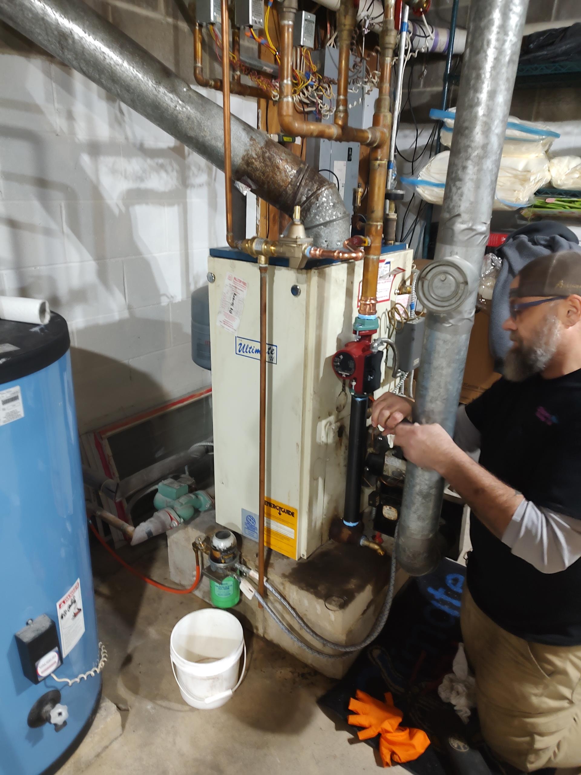 Arrived on site to repair and perform maintenance on oil hot water boiler. We began by draining down the system then we removed rotten and damaged parts including cast iron pipe bell and gosset pump and fill and back flow . We installed new grunfish pump new inch and a half pump flanges new cast iron riser and new watts fill and backflow. We purged the boiler test it all functions and confirmed everything's operational at this time. In addition we performed maintenance we changed the nozzle 85 70° a. We changed pump screen and installed a new Gerber style filter We scrubbed all flu piping took apart the boiler scrubbed and vacuumed out the inner combustion chamber. Everything is operational at this time.