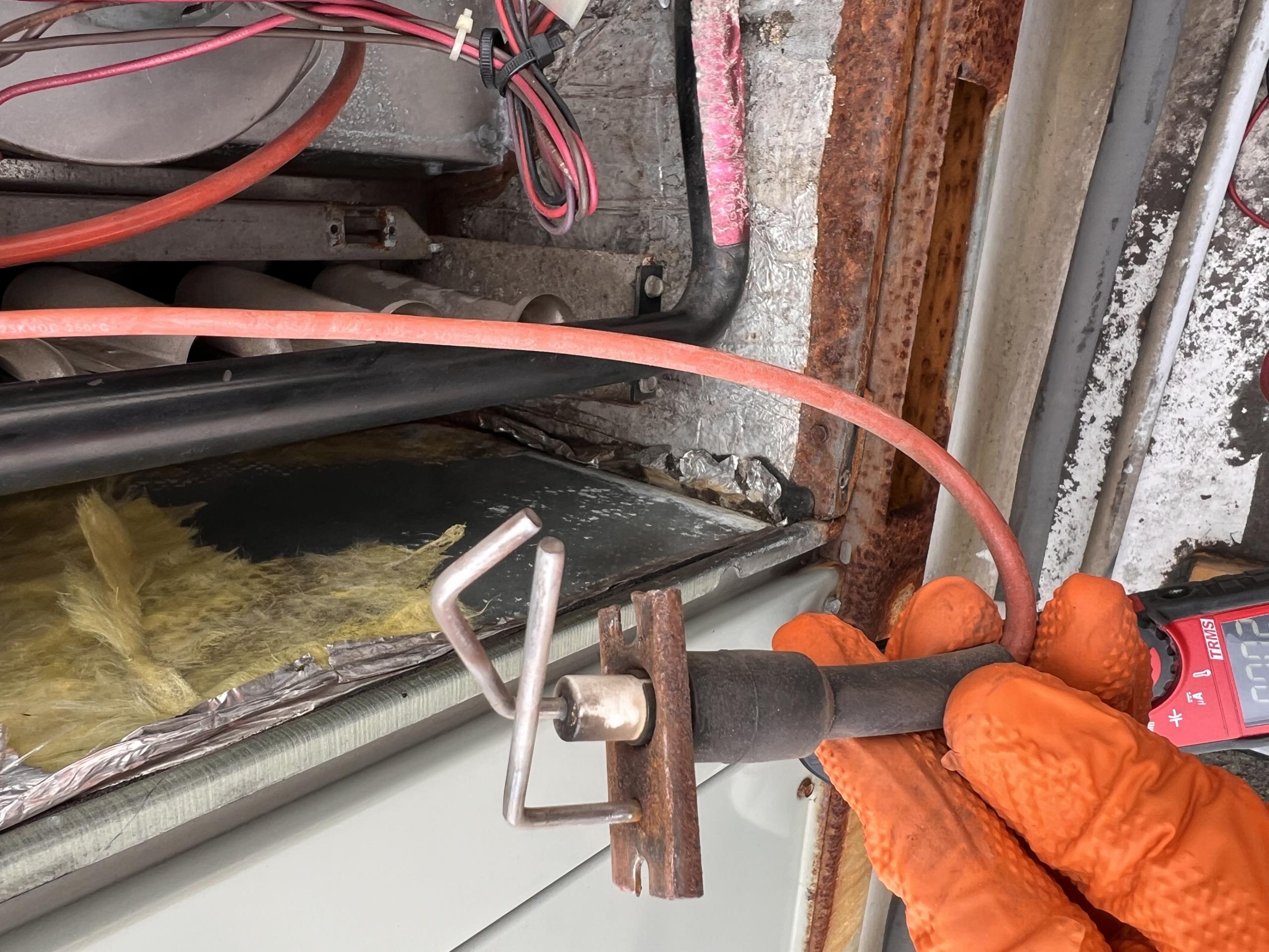 Removed old heat exchanger. Found cracks and old heat exchanger. Making flames roll out. Installed new heat exchanger on train rooftop. Installed new pressure switch, roll out switch and pressure switch tubing.