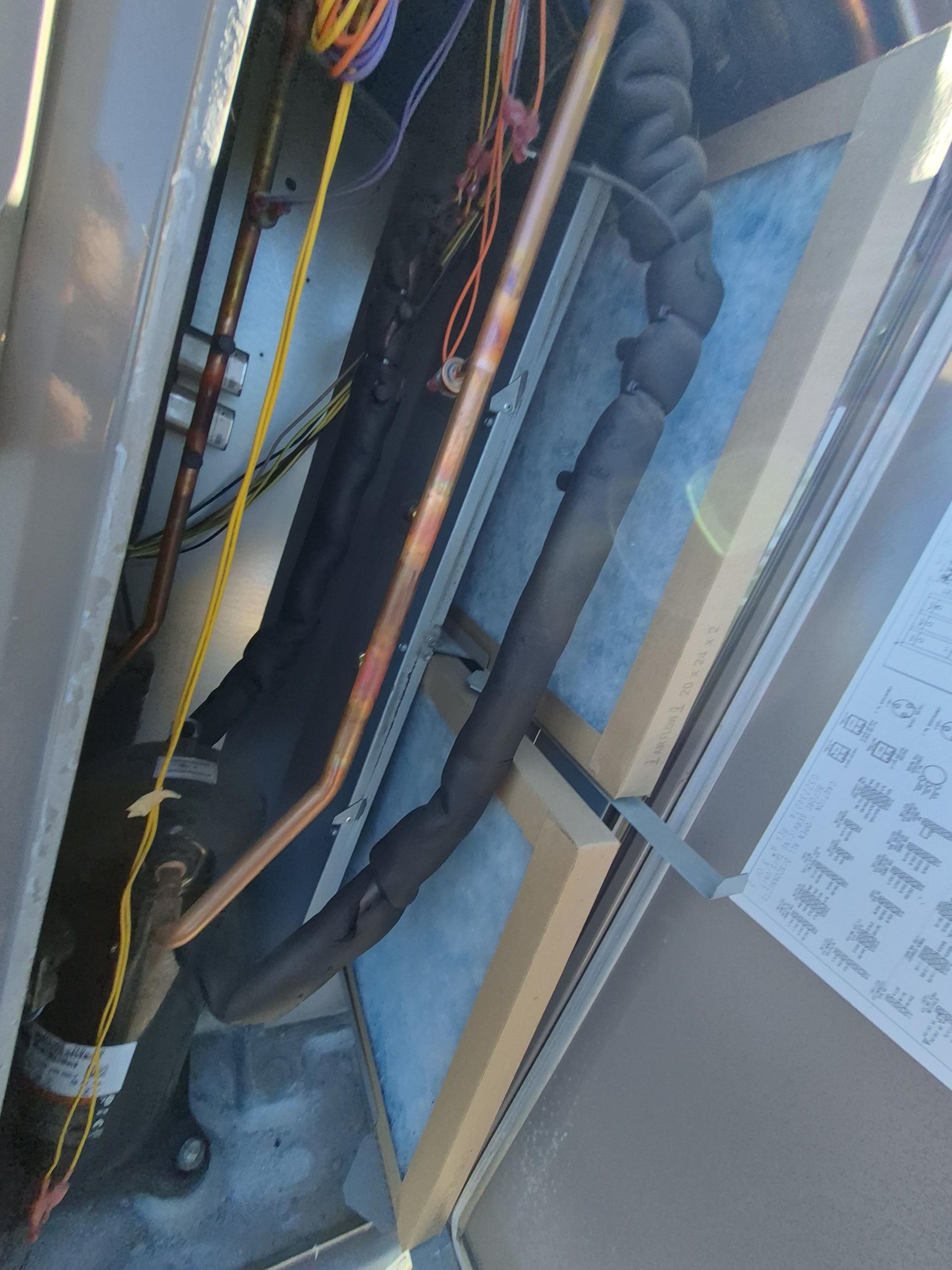 Arrived onsite for ac maintenance on 1 system . Changed 12x24x1 filter. Turn AC on to confirm operation. Checked all electrical. Chemically Cleaned outside unit, measured pressures for R22 at 60/90psi with 21 degree sub cooling with outside temperature at 43degrees. Measured temperature drop at 16 degrees. blew out condensate line. Performed efficiency test utilizing MeasureQuick. System running but may be slightly low on refrigerant.