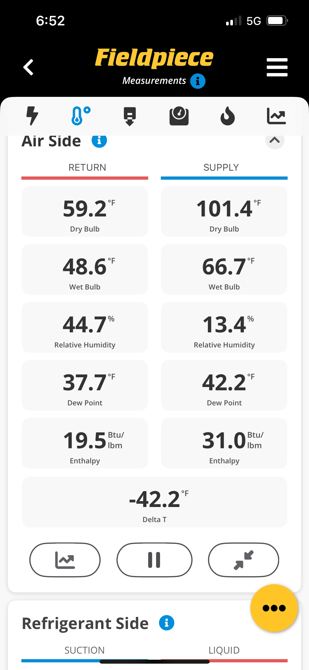 Arrived onsite for ac maintenance on 1 system. Asked customer to turn AC on to confirm operation. Checked all electrical. Chemically Cleaned outside could, measured pressures for R22 at 59/135psi with 6 degree sub cooling with outside temperature at 65 degrees. Measured temperature drop at 15 degrees. Cleaned evaporator coil and condensate line. Performed efficiency test utilizing MeasureQuick. System running but not well; received a grade of “D” Homeowner will look into upgrading system next year
