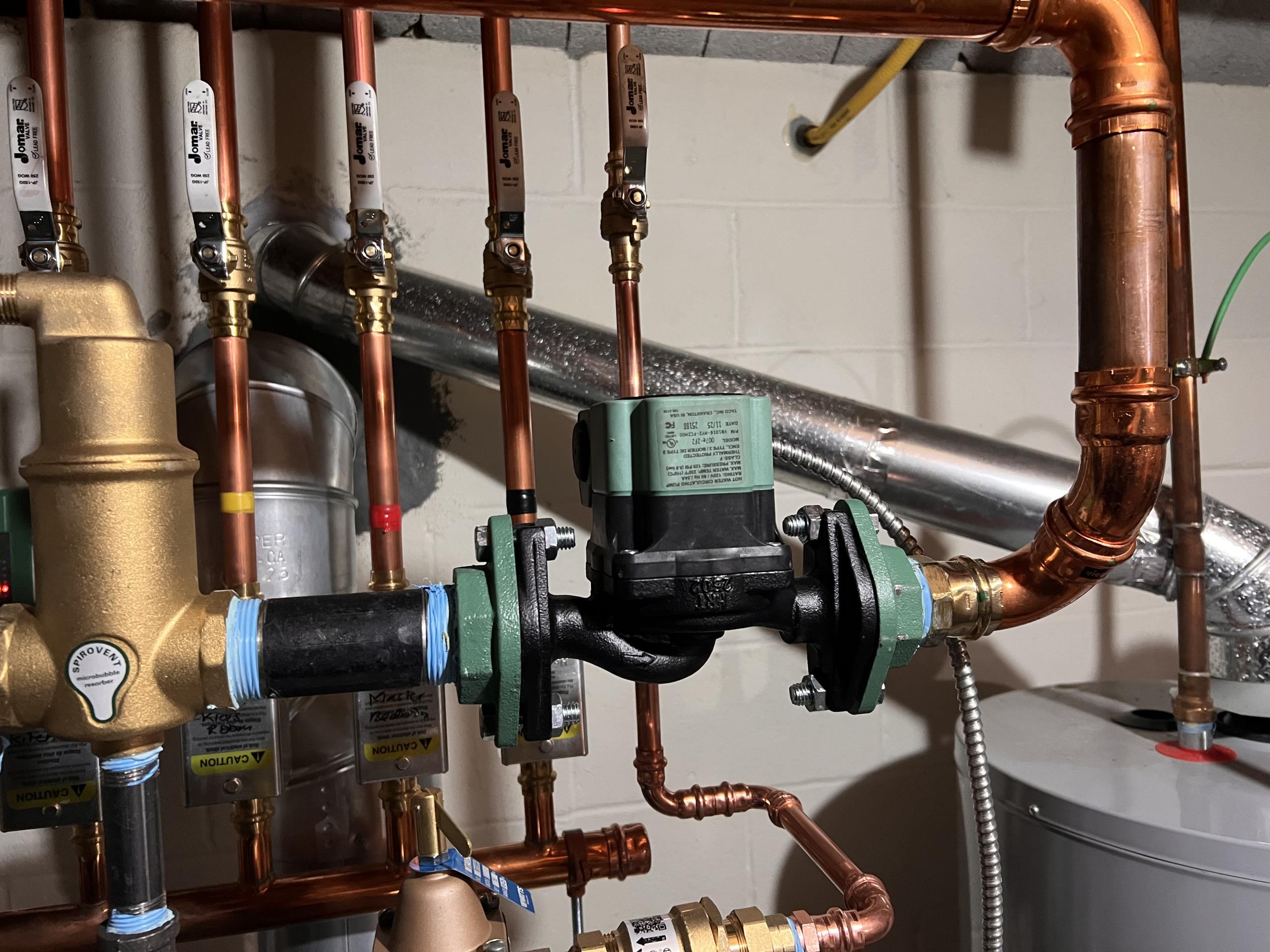 Arrived on site to investigate humming noise from recently installed system. Upon investigation we found that the units taco circulator pump is flowing too much velocity when only 1 zone calls need to return to install new adjustable speed pump.